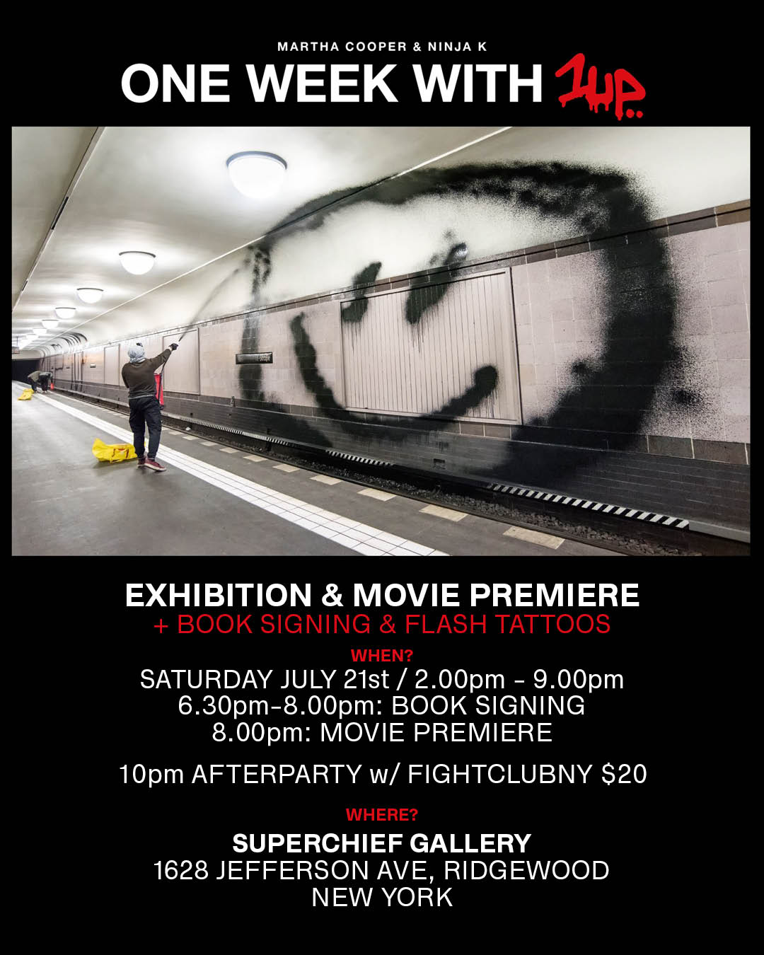 "1 Week With 1UP" is the epic book result of SKG artist Martha Cooper and photographer Ninja K'x recent project documenting the globally famous Berlin based graffiti crew, 1UP. To celebrate, Superchief Gallery of Ridgewood, Queens is hosting a book signing, exhibition, movie premiere, and after party this Saturday, July 21.