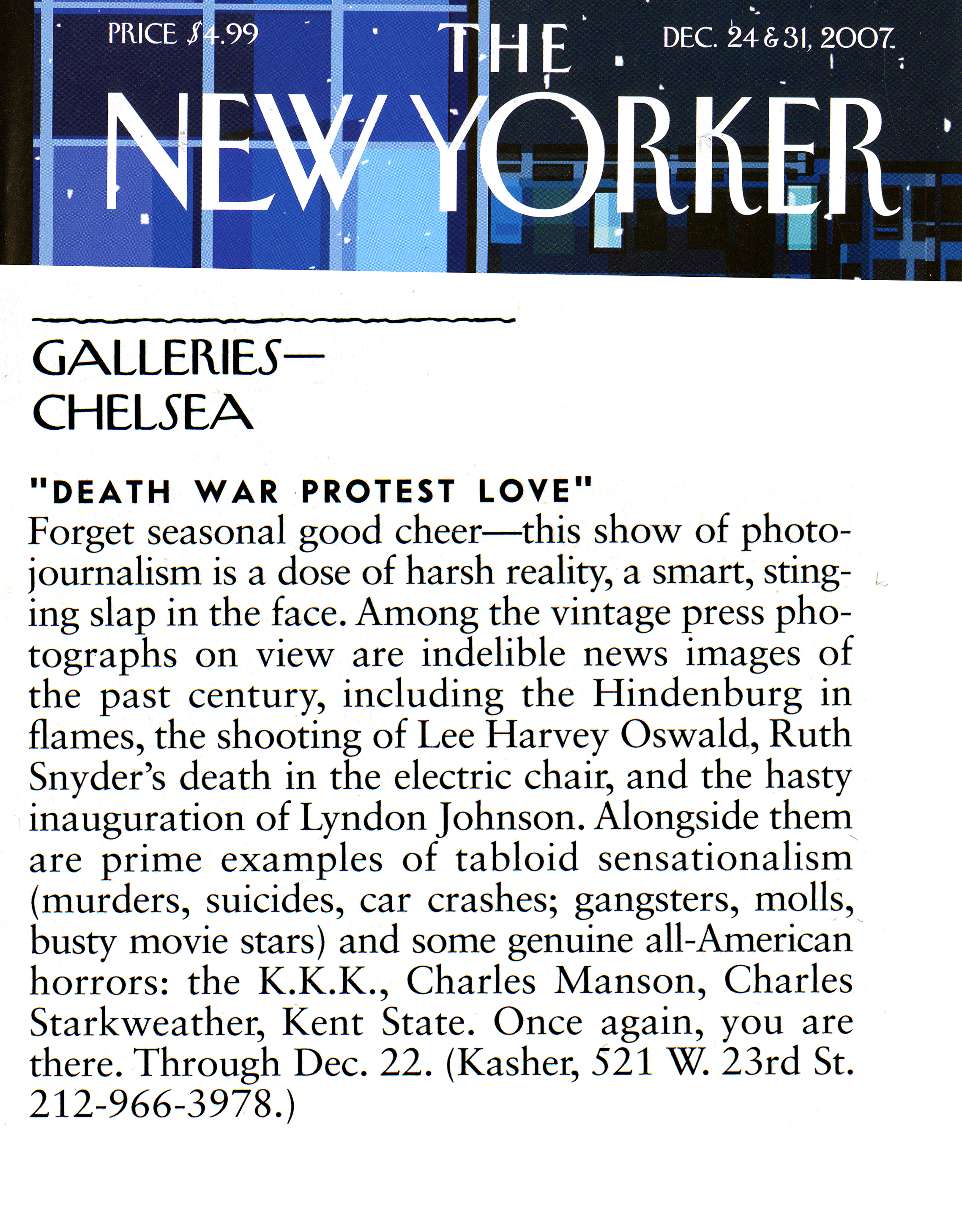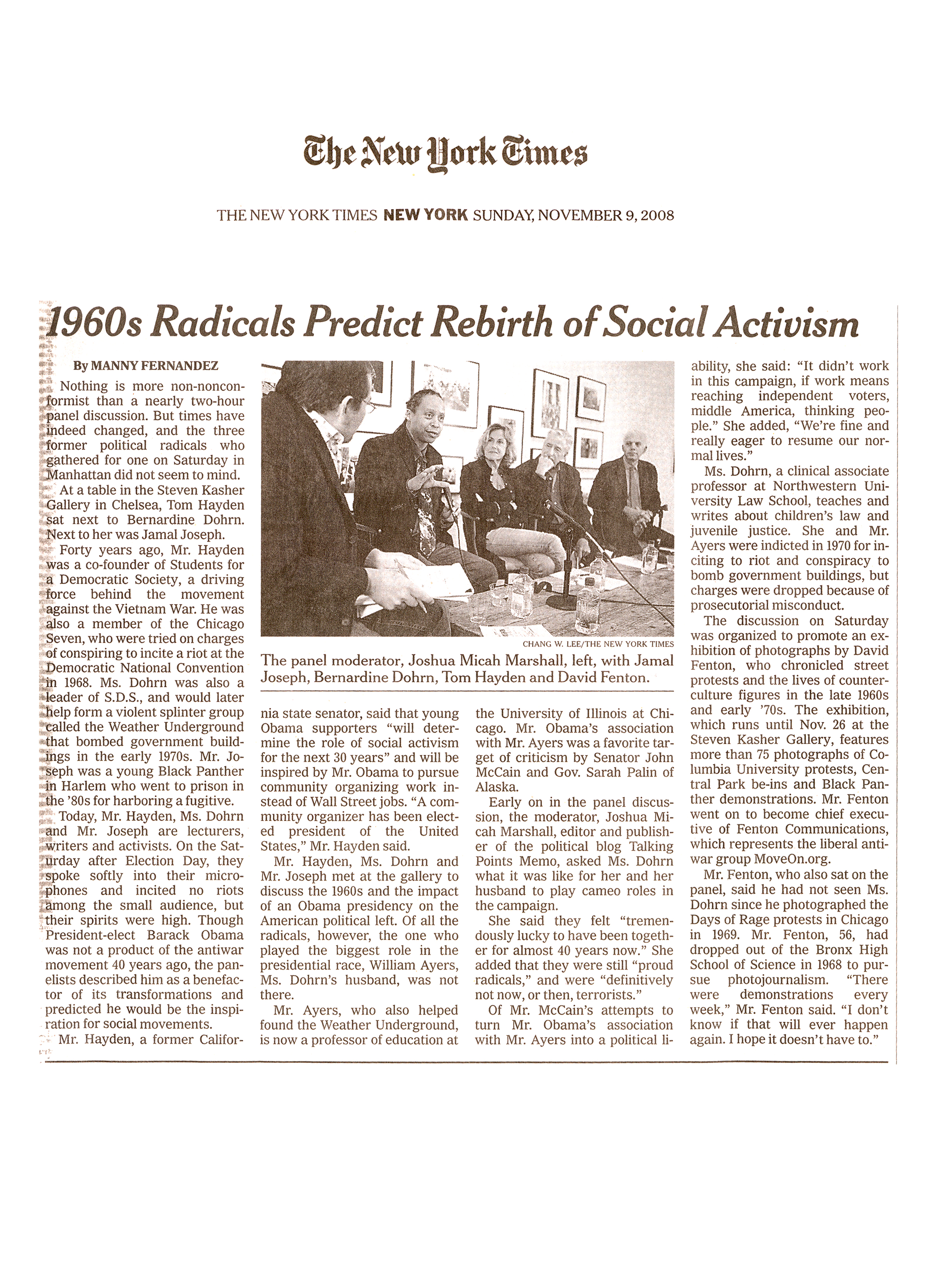 Fred W. McDarrah's photographs are featured in The New York Times in a piece titled "Seven Ways the Village Voice Made New York A Better Place." Reporter John Leland discusses the newspaper's efforts to create social change in New York, including vanquishing Tammany Hall, exposing corrupt politicians and landlords, giving a platform to feminists, and covering racial violence.